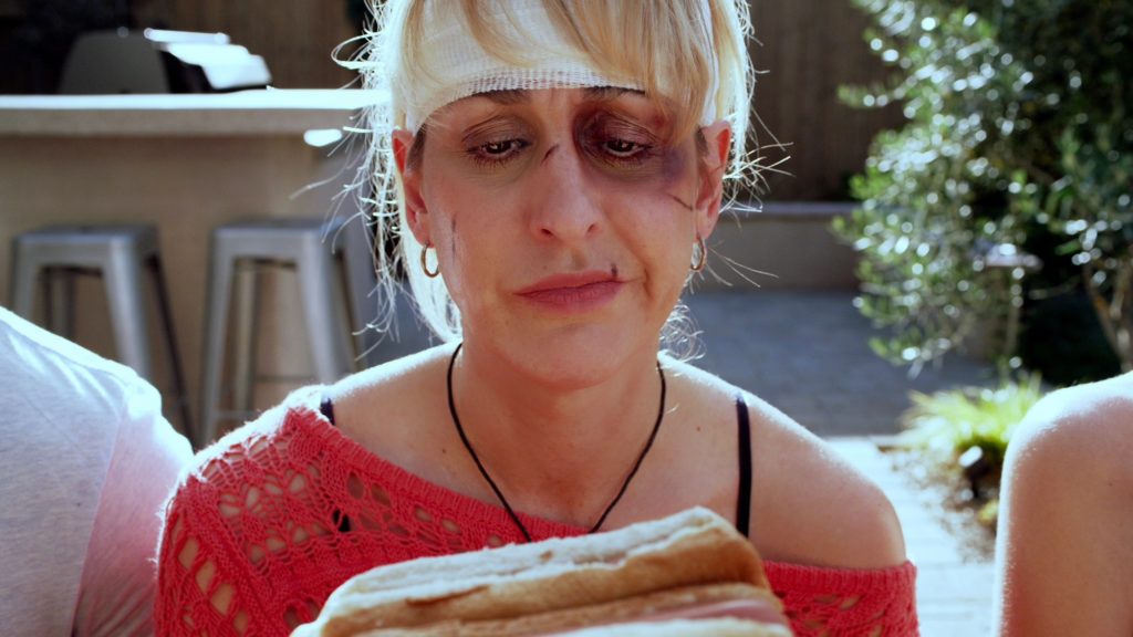 Nicole Sobchack: Oh my god. We are so lucky. Our makeup artist and she did our hair too was Stacy Rosas. She was incredible. She made me look like death in our vegan episode, which is “There’s No Tiffany, Only Zoul!” She had to make me get all bruised up for the Marion episode, which was “Truth, Dare, Or Obamacare.” I go through a glass wall. I had glass in my leg. Yeah, I was not the pretty girl throughout this whole entire shoot. She got to do Andie all beautiful and just a little powder on Ben and then hours with me, but she did such an amazing job. It’s awesome.