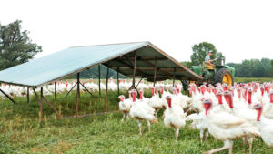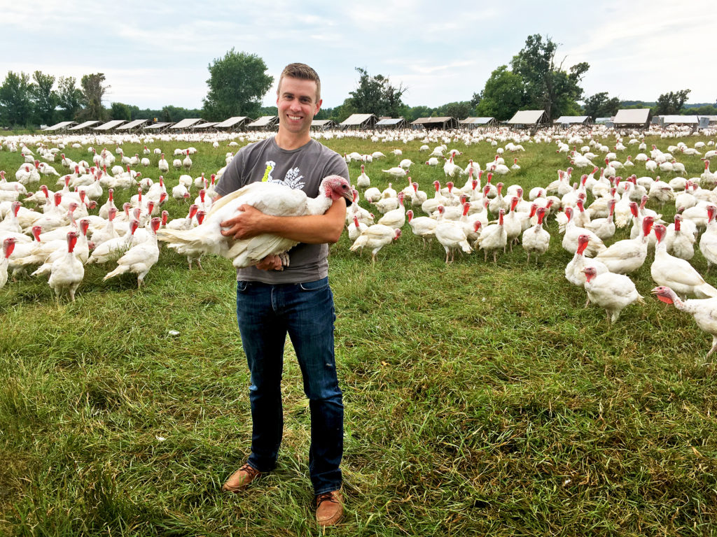 Pasture-grazed turkeys are allowed to roam freely and provided shelters that are moved throughout the farm at sustainable intervals to assure that the next generation of turkeys is provided a healthy environment in which to grow. Picture here, John Peterson with his turkeys.