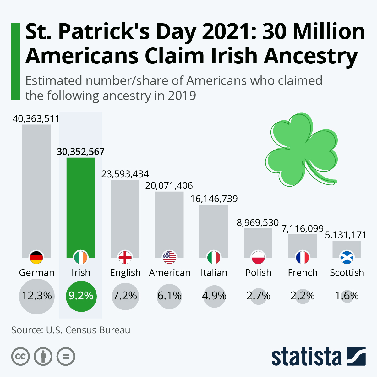 Given the strength of those links, how many U.S. citizens can actually claim Irish ancestry? According to data from the U.S. Census Bureau, some 30.4 million Americans claimed Irish ancestry in 2019, 9.2 percent of the population. German ancestry is ahead, however, with 40.4 million U.S. citizens claiming ancestral links with Europe’s economic powerhouse. A further 7.2 million Americans have historical familial ties witn England.