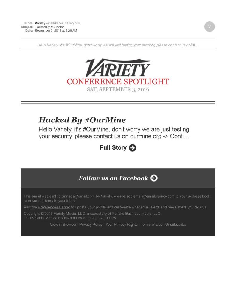 It’s not a happy Saturday for Variety Magazine’s online site. The prominent Hollywood mag’s subscriber list has been hacked by a group known as #OurMine. Multiple emails are being sent to the list and although they appear to be from Variety, lead to either a list of links, to the OurMine site, or to a “dead” page at Variety.