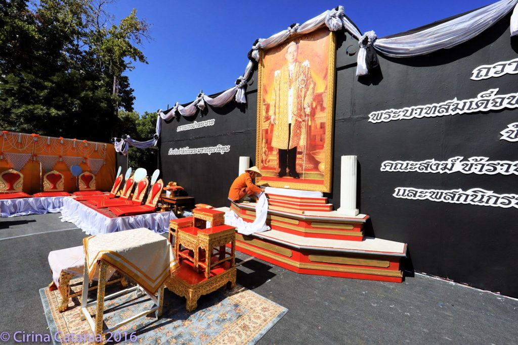 At the entrance to the temple, monks in bright orange robes were busy building platforms, draping pictures of the King and preparing for the visitors expected on Sunday. Over 800 worshipers had participated in chanting and prayer on Saturday and more would be coming today.