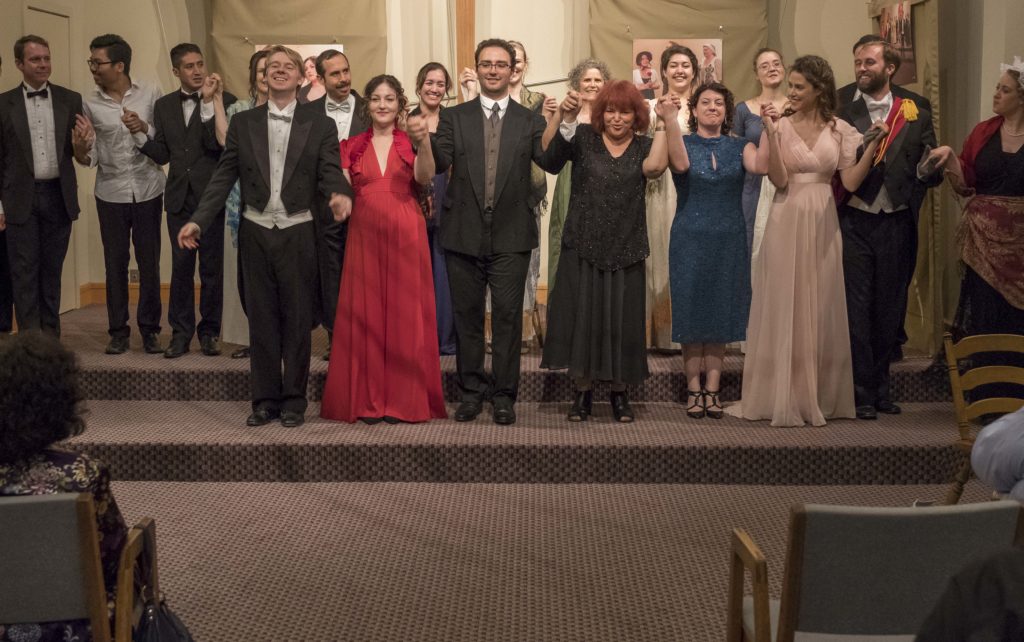 Ms. Galina Barskaya, Artistic Director of the Independent Opera (front row, 5th from right), and the cast of Eugene Onegin take a well-deserved bow. (Photos by Ron Batzdorff)